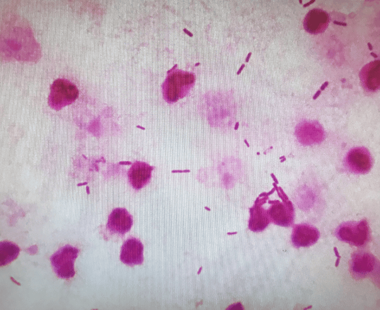 ※写真は尿検体です。染色をして 白血球や菌を見つけます。