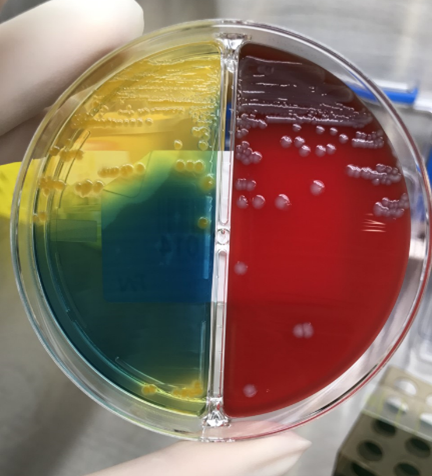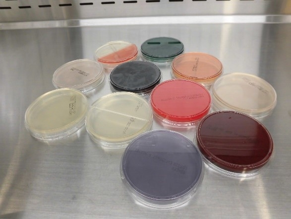 喀痰や尿などから病原菌を目に見える菌塊とするために、様々な種類の寒天培地に塗り広げ時間をかけて発育させます。