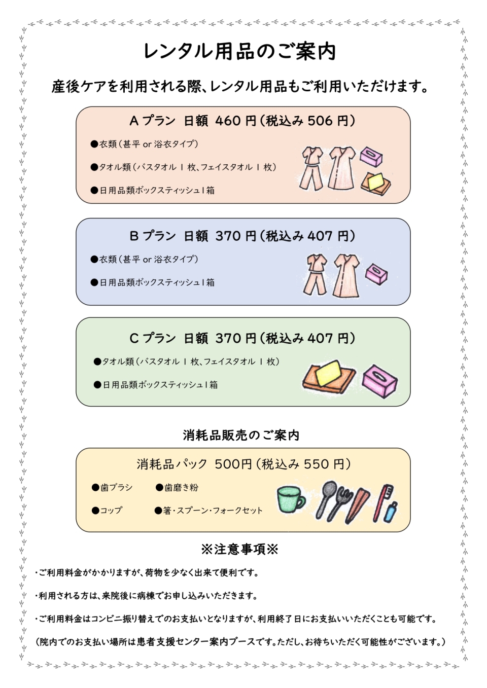 ・着替え・生理用品・タオル、バスタオル・洗面、入浴物品・宿泊の方はルームウェア